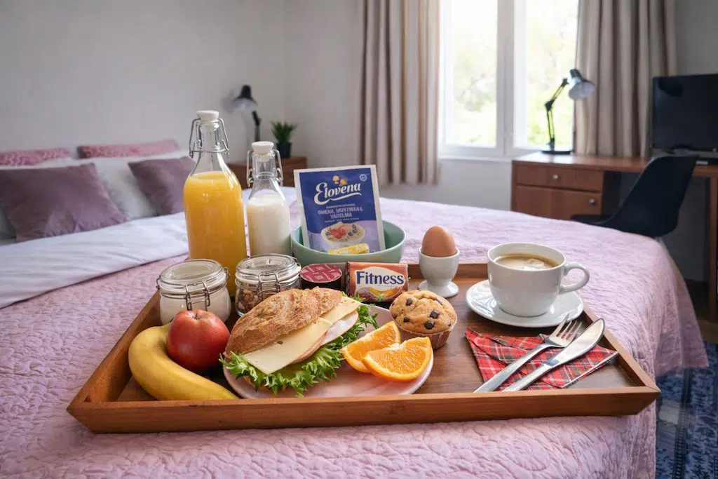 Breakfast includes a ham and cheese sandwich, an instant oatmeal, yogurt, granola, a boiled egg, an apple, a croissant orange juice, milk, coffee and tea bags. The price is 12 EUR per person.